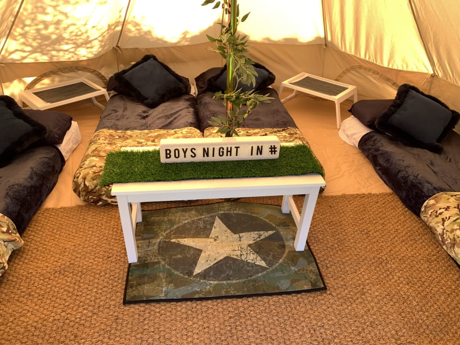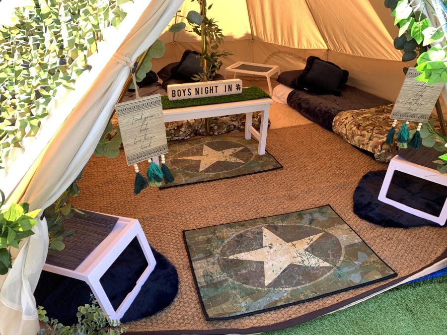 Here we have the camouflage theme option for your bell tent hire. This package comes with everything you see in the photos. All of our accessories come matching for that look of army experience, for an exciting slumber party under the stars!