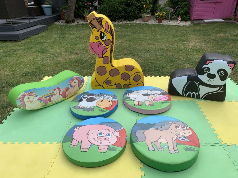 Our Animal Soft Play Bundle includes a variety of interactive elements that will keep children engaged and entertained. It features large farm animal stepping stones, allowing kids to hop from one animal to another, improving their balance and coordination. The bundle also includes a ride-on giraffe and panda, giving children the opportunity to have a fun and imaginative ride. The unicorn rocker adds an extra touch of magic and excitement.💫🚂🎠